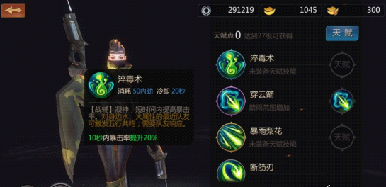 1.淬毒术。三个技能分别是,增加暴力并减速,重置穿云箭暴雨梨花的CD,增加暴击率提高暴力伤害效果。在这里看小伙伴怎么选择了生存率高的选第一个,多个技能输出选第二个,高爆发伤害选第三个。