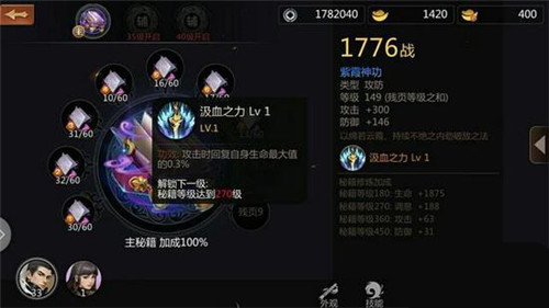 我们完成第二章【珍本秘籍】后会开启【秘籍】系统,每个角色可以装备3本秘籍,主秘籍属性加成100%,辅秘籍1属性加成30%,辅秘籍2属性加成20%。