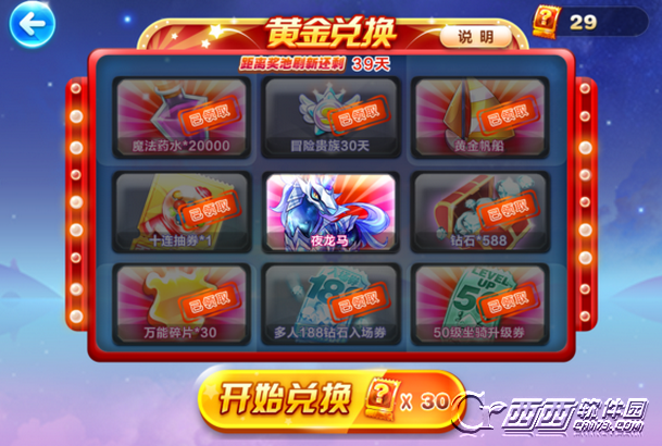 2、积分十连抽券*1→188钻石入场券→冒险贵族30天→588钻石→魔法药水*20000→万能碎片*30→50级坐骑升级券→黄金帆船→夜龙马