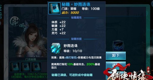 秘籍效果:提高雨打梨花10%基础攻击,200%基础忽闪。