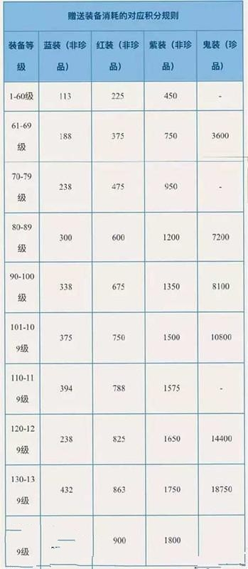 注意:珍品蓝、红、紫装消耗的受赠积分为下表普通蓝、红、紫装对应积分的3倍。
