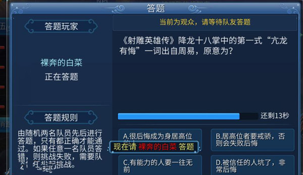 击败机智鬼后,需要与被打败的机智鬼对话进行答题。答题抽取队伍,2名玩家先后进行答题,每道题答题时间15秒,2道题全部答对通关。