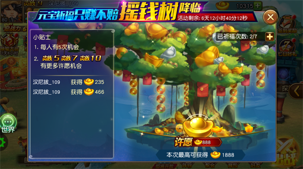 经过了解,原来摇钱树就是一个让玩家只赚不赔的活动,通过使用元宝来进行摇钱树许愿,然后摇钱树就会根据玩家的许愿姿势与诚意来回馈给玩家元宝。只赚不赔哦~
