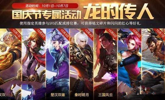 10月1日~10月7日,每日参与【龙的传人】国庆系列对战活动,击杀敌方英雄2人得闪闪的红心*1+铭文碎片*10,击杀敌方英雄5人得闪闪的红心*2+铭文碎片*10+击杀2人奖励。