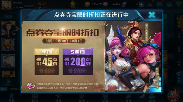 王者荣耀点券夺宝限时折扣活动开启,点券夺宝限时折扣活动详解。王者荣耀手游在今天开启了新的活动-点券夺宝限时折扣活动,这个活动的优惠力度挺大的,还是挺适合玩家进行抽奖的,很多玩家都对这个活动很感兴趣,今天西西小编就来为大家详解点券夺宝限时折扣活动。