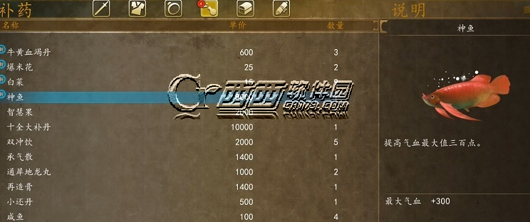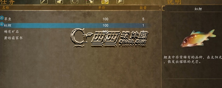 虹鲤:单价100。鲤鱼中非常稀有的品种,在太阳光底下散发出耀眼的光芒。估摸着是任务用。