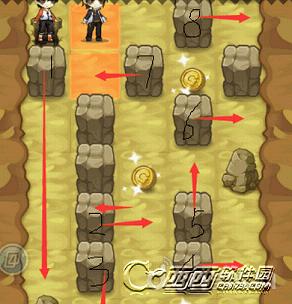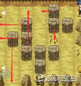 首先把石头1向左推一格,接着把下边的石头2往下推到刺那里,之后把左边的石头3一直推,推到墙边;然后把下边的石头4也推到墙边。捡完金币后回到中间,把左边的石头5推到墙边,最后把石头6推到墙边。