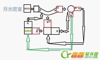接下来就是路线讲解啦。其实到BOSS房间的路线很简单的。依据这张路线图,我们可以发现,最快捷的路线就是一路向左哦~!三个左拐就到BOSS面前啦。迷路君&迷路姬们再也不用担心在月光密室迷路了。