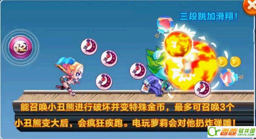 电玩萝莉是款三段跳+滑翔女性角色,以召唤小丑熊进行破坏并变特殊金币,最多可以召唤3只小丑熊,小丑熊变大后会疯狂疾跑,还会对扔炸弹,皇家狮鹫再非冲刺状态下破坏障碍物可以变换高分圣杯,还可以召唤黄金印记,小丑熊破坏障碍物可以加2200分,两者都是依靠破坏障碍物获得分数加成,在加上宠物暴风雪女以及精灵小丑熊的分数加成,这套组合搭配在一起应该可以吃到不少的分数值。