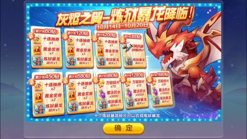 5.游戏内,累计充值满450钻石(不含返利部分),送十连抽券*2+黄金奖券*2+炼狱暴龙碎片*1