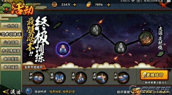 活动规则:玩家在训练池中刷新结印手势,每个忍术由多个结印手势组成,集齐所需手势即可激活忍术,领取对应的奖励。玩家每天可以重置活动,活动奖励可以刷新,快来参与赢取飞段碎片。