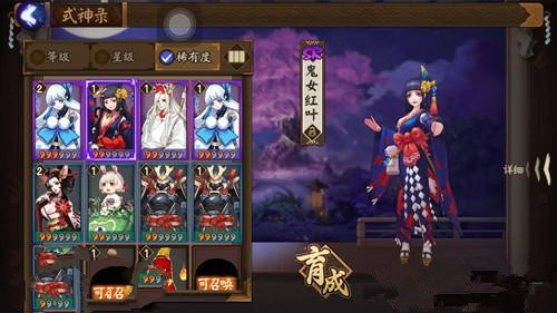 式神简析:鬼女红叶——阴阳师手游游戏中的AOE输出型式神,她的群体攻击能力在SR式神中还算不错,尤其是暴击,非常厉害,刷怪或者是练式神都可以,很是实用,虽然说有很多SSR式神都比鬼女红叶强大,但SSR式神的技能强化难度普遍都很高,没有高级式神的话,培养一只鬼女红叶也是可以的。