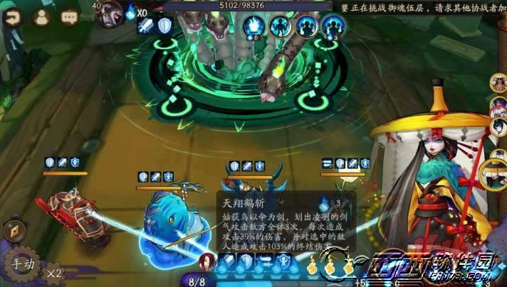 如何让兵佣百分之百嘲讽不至于翻车呢,这里我用了蚌精两件套,命中加15%,还有我的二号位置是蚌精,效果命中加成,我强化到了+9,我的总命中合起来有60%,给各位算一下嘲讽的几率,60%+(1*60%)=96%,所以大天狗放不出技能,就可以干他们拉。御魂我用的火灵。