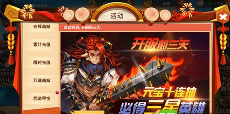 活动五:万千活动,尽享优惠豪礼。七日登陆领神将牛魔王;许愿瓶免费获得想要道具;限量限时在线商城,购完为止;连续7天充值累积达到一定数额即送主角齐天大圣;元宝10连抽必得三星英雄