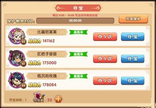 夺宝时应当将自身的战力和对手先作对比,不打没有把握的仗。当然你也可以根据系统提示的高概率和低概率选择想要抢夺的对象,要是想要快速抢夺,就点击夺5次按钮吧~