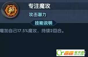 第二条子路的终点为专注魔攻,效果为增加自己17.5%的魔法攻击,持续2回合。触发条件为,登场之后随机触发,效果等同为为宠物提供一个额外的几率触发被动。17.5%的伤害加成非常的可观,在触发该被动之后2回合内可以打出高额的伤害。