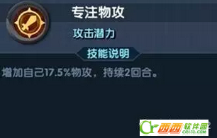 第一条子路的终点为专注物攻,效果为增加自己17.5%的物理攻击,持续2回合。触发条件为,登场之后随机触发,效果等同为为宠物提供一个额外的几率触发被动。17.5%的伤害加成非常的可观,在触发该被动之后2回合内可以打出高额的伤害。