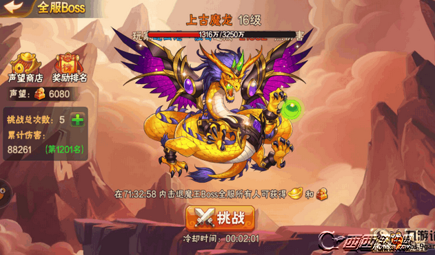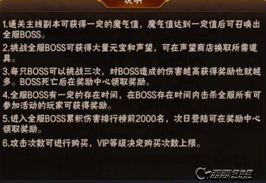 通关主线副本积累魔气值,魔气值达到一定值后可召唤全服boss