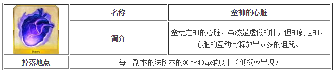 蛮神的心脏:俗称心脏,小头目级怪物“蛮神”身上掉落。产自每日副本的法阶本的30~40ap难度中(低概率出现)。随着剧情的推移应该也能见到。这类怪物血量较厚,对于缺乏强力输出的新人来说是个很大的麻烦。对付蛮神的方法是培养一个牛若丸报个贞德大腿去强怼,当然更好的办法就w是前期不要去碰它。综上所述,心脏是一个前期难以批量入手的素材。