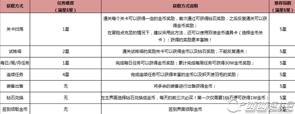 游戏内金币获取的途径有多种,以下就为大伙总结前期部分获取金币的方式,如下表: