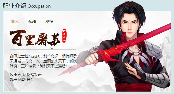 职业介绍:御风之士性情豪爽,剑术高神,相传师承天墉城。犹喜一人一壶酒独步天下,斩妖除魔。正如诗云:御剑天下逍遥游。御风派的衣着,十分干练,是修仙一族的经典着装。且衣服以单机游戏中天墉城的着装为原型设计,一贯的白紫风格,使玩家在职业选择界面就有一种熟悉感和亲切感。