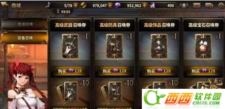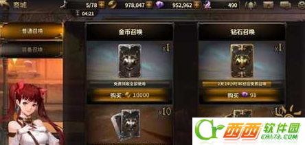可通过消耗金币或者钻石进行召唤,可以得到不同的品级的道具,通过消耗9W金币或者980钻石可以进行10次召唤(会额外赠送多一次召唤,一共可以获得11份道具),前者必定获得史诗级以上品质的强化材料,后者可获得传说以上品质装备以及其他道具;
