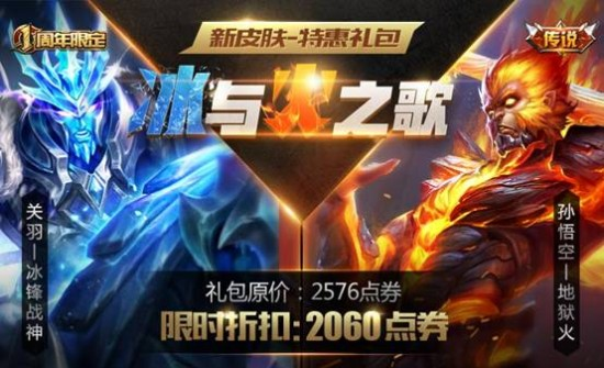 内含关羽限定皮肤-冰锋战神以及孙悟空传说皮肤-地狱火,都是傲娇的皮肤,只卖呆萌的价格,喜欢的召唤师千万不要错过哦!