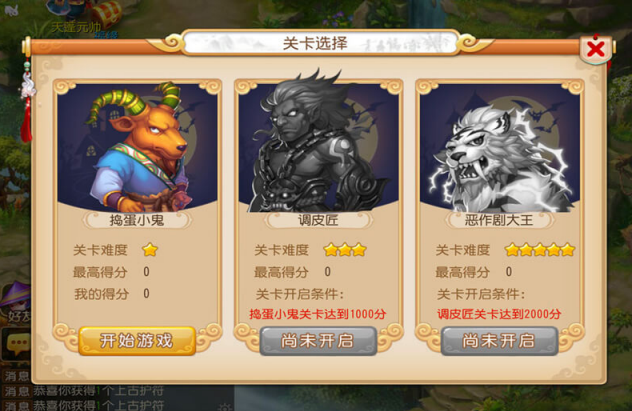 活动共有三个关卡,从简单到困难分别为:捣蛋小鬼关卡、调皮匠关卡、恶作剧大王关卡。