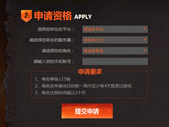 只需要在网页中填写平台、大区、角色名和手机号即可,如下图: