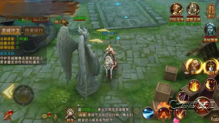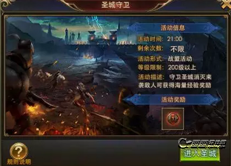 圣城守卫是一个全战盟参与的塔防副本,战盟成员需要在两位强大的NPC——雷霆圣使与烈焰圣使的帮助下,赶走入侵战盟的破坏者,保卫女神雕像!守卫圣城消灭来袭的敌人可获得海量经验奖励,是战盟成员的又一升级圣地!