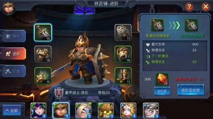 英雄装备的强化可以通过消耗一定的材料来完成。我们以洛伦为例,可以发现消耗一定数量的精铁可以强化指挥官头盔,消耗一定数量的粗磨铁可以强化先锋重甲,而消耗精石可以强化圣光誓约。伴随装备等级的强化,其功效也会增加,比如增加最大生命值、物理攻击数值,等等。