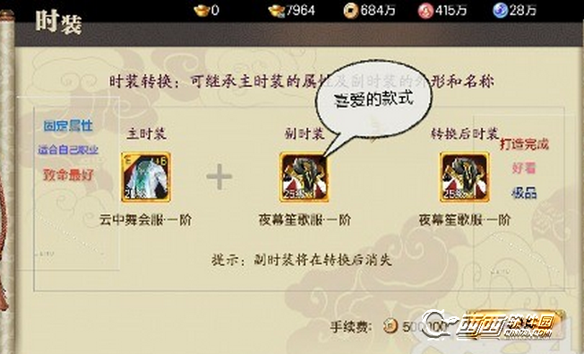第二时装的外形和属性。时装主属性防御,固定属性随机生成。转换时装固定属性不变,随机属性发生变化。首先选择一件固定属性适合自己的时装(加致命最好),再选择一件自己喜爱的外形时装。进入时装界面点击转换功能,一号放置属性时装,二号放入外形时装。就出现了又好看属性又好的时装。