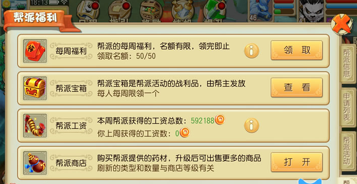 谁说没有免费的午餐?在《大唐仙妖劫》中,只要加入帮派就会有意外的惊喜。帮派每周会准备50人名额的福利让玩家领取,不仅如此,每次帮派活动结束后,帮主会发放一批帮派礼盒,入帮5天的玩家能够每周领取一个。而且完成帮派的任务,每周还能够获得帮派发放的工资,真是躺着也能拿奖励。帮派任务通常很简单,跟NPC聊聊天,到野外打打怪,手指轻点,就能够获得丰厚的奖励。这么好的帮派专属福利,千万不要错过哦。