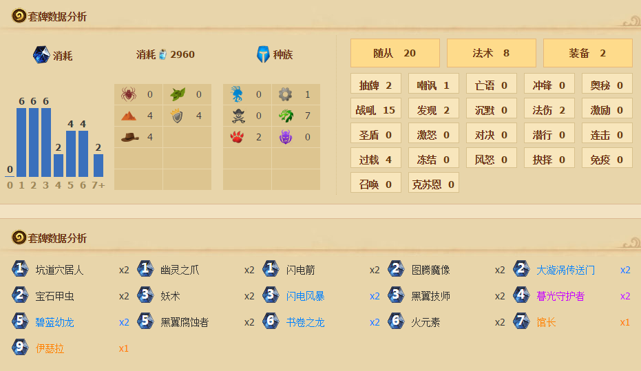 宝石甲虫:这张卡牌算是强行加进去的,因为我们在过牌上有一些缺陷,只有蓝龙的两张过牌,而没有带马桶。所以外挂了一个馆长。如果单独用馆长去过一张龙类卡组,那么也是亏本的买卖。因此我们就带上宝石甲虫。3费对于萨满来说是一个很不错的选择费用,有大解呱、有AOE闪电风暴、元素毁灭、有嘲讽狼魂、有恢复治疗波。这样看来宝石甲虫反而是一个不错的选择。