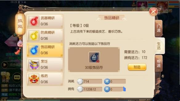 在梦幻诛仙手游中一共有五种生活技能,分别是武器精研、防具精研、饰品精研、烹饪和炼药。其中武器、防具、饰品精研都是用来打造相应的符,用于打造专用。而烹饪则是pk和宠物专用技能,炼药则是专用pk技能。