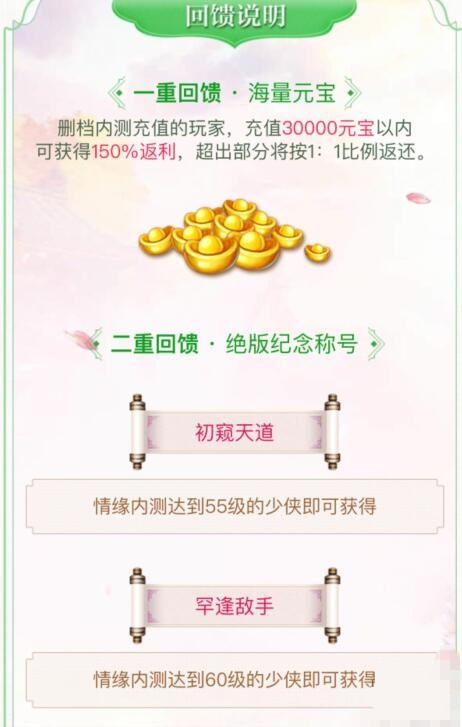 6、9月6日焕新内测中充值3万元宝以内获得150%返利,超出部分将按1∶1金额返还;返还元宝不绑定