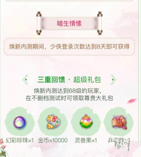 9、9月6日焕新内测中达到68级的玩家,可额外获得超级大礼包一个,内含:兵刃阵x1,幻彩珍珠x1,金币x10000,灵兽果x110