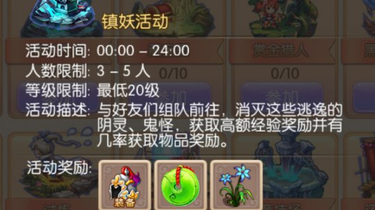 镇妖任务只要大家在活动界面找到并选择参加就可以的,然后系统会帮助你自动寻路的,每天能够做100次的。不过在参加的时候有一个要求就是必须是组队进行的,队伍里至少要有三个人,另外队友之间不能够是仙侣关系的哦。大家可以自己创建队伍当队长,也是能够加入其他队伍的,大家选择自动匹配就能够快速找到合适的队伍了,这样也是能够节省不少找队友的时间的啊。
