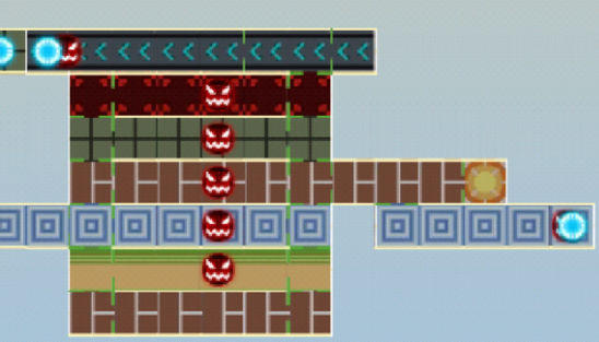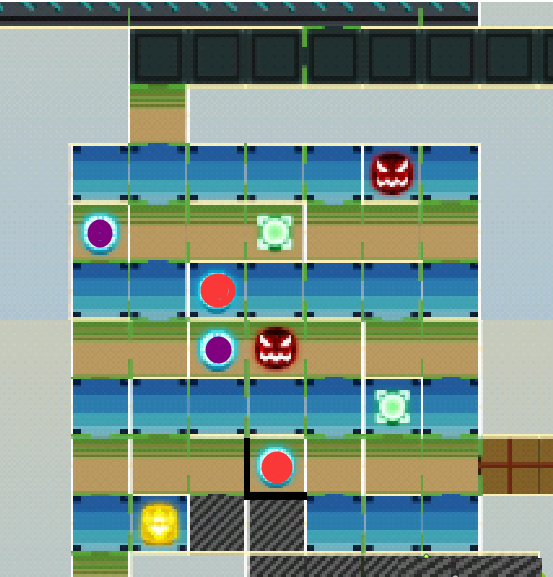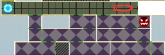 然后是方格阵颜色对应的点可以互相传送,黑线是不能走的地方,中间是宝箱boss、大血牛、还要用陷井杀死才能进宝箱房,右上角是通往下一关卡的boss要打死,左上角的口可以回去探一下路,灰色的地方一样要到后面才能开