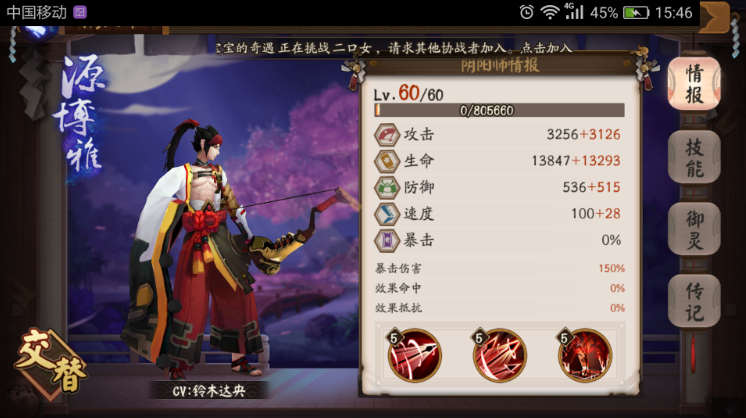 阴阳师手游源博雅满级属性一览: