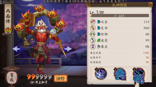 怒目:被动型技能,有两种攻击效果,当两面佛为红脸时能够降低攻击对象的防御属性,当为蓝脸时则降低敌方的攻击强度。