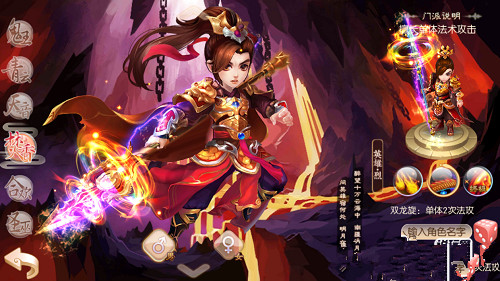 无脑刷怪自动战斗时(如乱世妖魔、镇妖活动、幻月洞府等),只使用八荒玄火龙(群体法术攻击技能)。需要手动操作时(如副本、青云志、妖兽突袭、十二生肖等),根据情况选择群体攻击技能八荒玄火龙或单体攻击技能双龙旋,单体攻击常用在需要集火目标时。另外,在特殊的有隐身怪物存在时,可释放火眼金睛。在集火输出不够时可开启终极奥义烈焰无双击。
