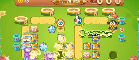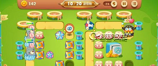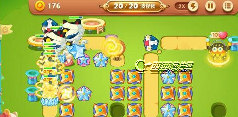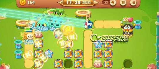 1.这关的怪物非常过,而且快,我们需要的是范围伤害炮塔,也就是大量的瓶子炮和飞机。减速就用冰冻星。