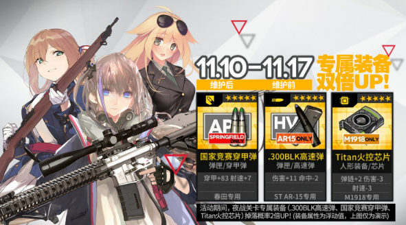 本次《少女前线》“专属装备掉率提升”活动的时间为:11月10日维护后~11月17日维护前。在一周时间内,指挥官通过夜战地图的鏖战,就有更大的机会获得专属装备,为心爱的战术少女大幅提升战斗力。