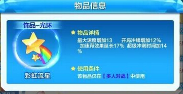 彩虹流星是多人光环,彩虹流星可增加最大速度13,开局冲锋增加12%,加速带效果延长17%,超级冲刺时间加14%。彩虹流星是非常不错的多人光环,增加速度和加速时间,喜欢多人玩法的玩家比较适合入手彩虹流星。