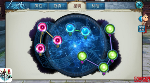 玩法介绍:可点击人物,选择【星魂】开启玩法。仙友可根据自身门派选择星魂进行镶嵌,拆解星魂可进行获得星尘用于升级,当一颗星魂达到满级将开启下一个镶嵌孔。同时,星魂之间也可通过关联激活其他镶嵌孔。