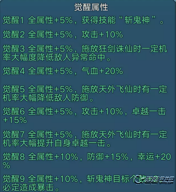 万剑一的觉醒属性以攻击为主,而且还可以增加各方面输出属性,例如卓越一击的几率提升,幸运的提升以及觉醒9之后的必定暴击效果。如果万剑一能够觉醒到9。应该没有人能够和他媲美。