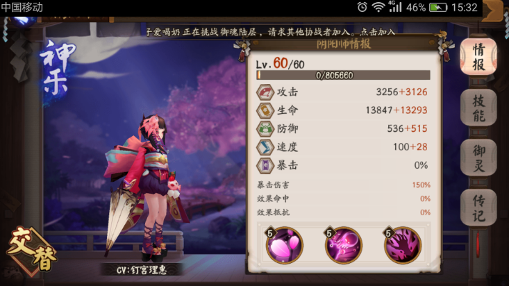 【天狐神火】被动!神乐受攻击时,30%概率对敌方全体造成神乐攻击力100%伤害,满级伤害增加至120%,而且好像还能让敌方持续掉血,这是游戏里面显示出来的,只是技能里面没有介绍。