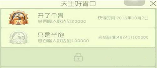 如上图所示,这个称号的名字叫作“天生好胃口”,称号下主要分为“开了个胃”和“只是半饱”,所要达到的条件就是总吞噬人数达到20000和100000的数量,所以小伙伴们要尽量多的去吞噬对手哦。