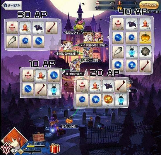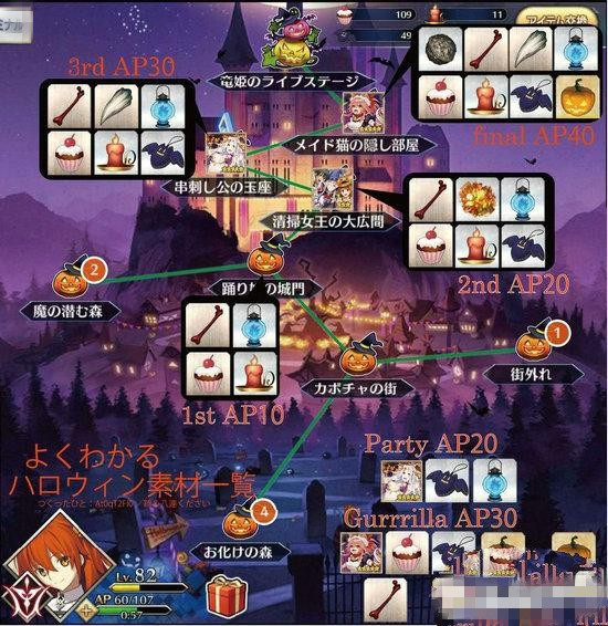 以上两张图结合来看就是本次万圣节活动的材料掉落总体情况了。可见40AP本掉落的种类最多,因此也是比较推荐刷的,然后就是必有南瓜的30AP的突击本和有八连双晶的20AP本。因此礼装方面就比较推荐使用伊莉雅,太太和人妻狐,如果cost吃紧的话建议让1-3星的servant来背礼装(可见练低星servant的必要性)。